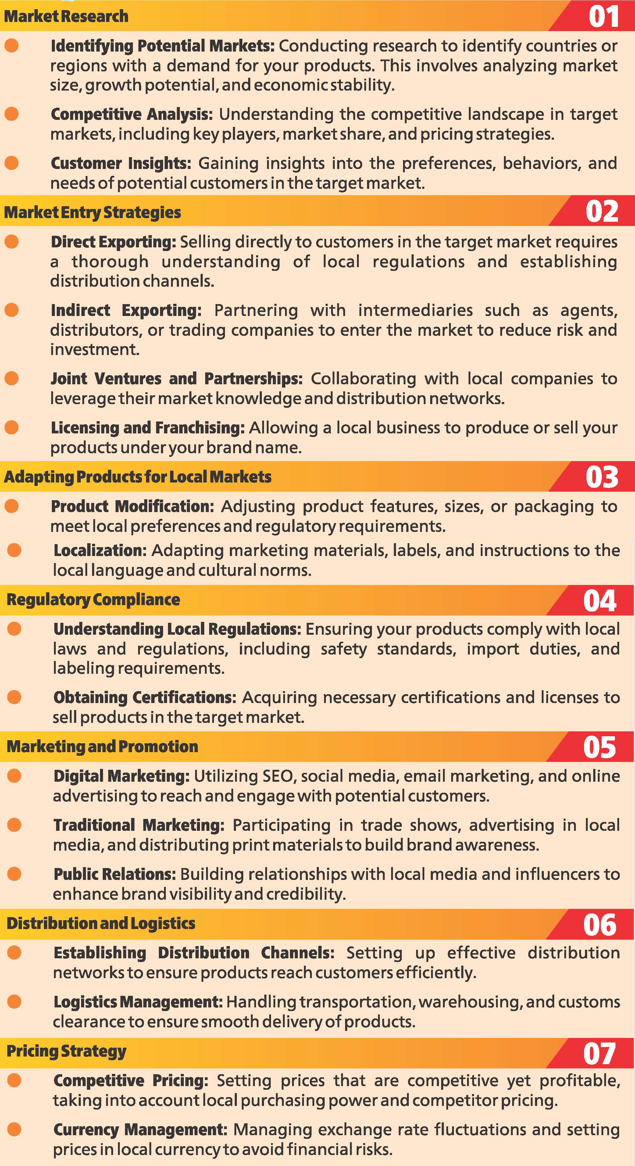 Market development for exports involves strategic efforts to expand the reach of products into well established as well as new international markets. This process includes identifying potential markets, understanding local needs, and adapting products and marketing strategies to fit those markets. Effective market development either through online and/or offline can significantly increase a company's sales, generate revenues and global presence.