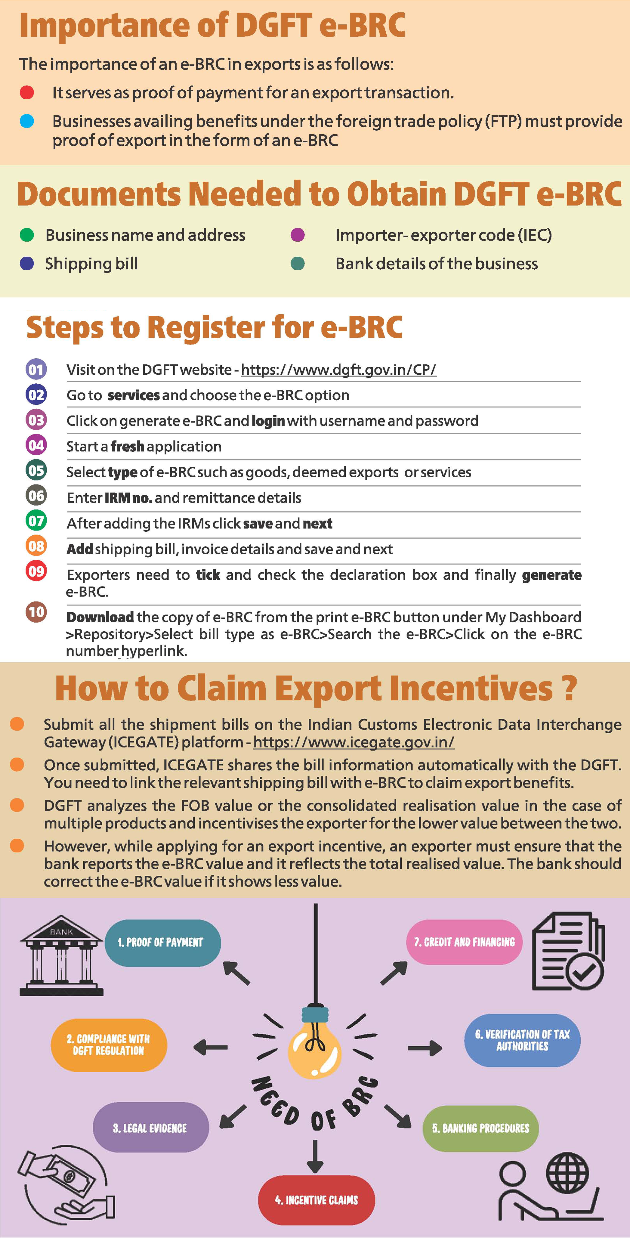 ving as evidence for the exporter that the payment for exported goods has been received. The e-BRC system implemented by DGFT, streamlines and digitizes the export documentation process, reducing paperwork, enhancing transparency, and facilitating quicker processing of export benefits and incentives. It also made it easier for the DGFT to keep track of lengthy incentives calculation. eBRC also acts as a repository for the inward (IRM) and outward (ORM) remittances uploaded by banks