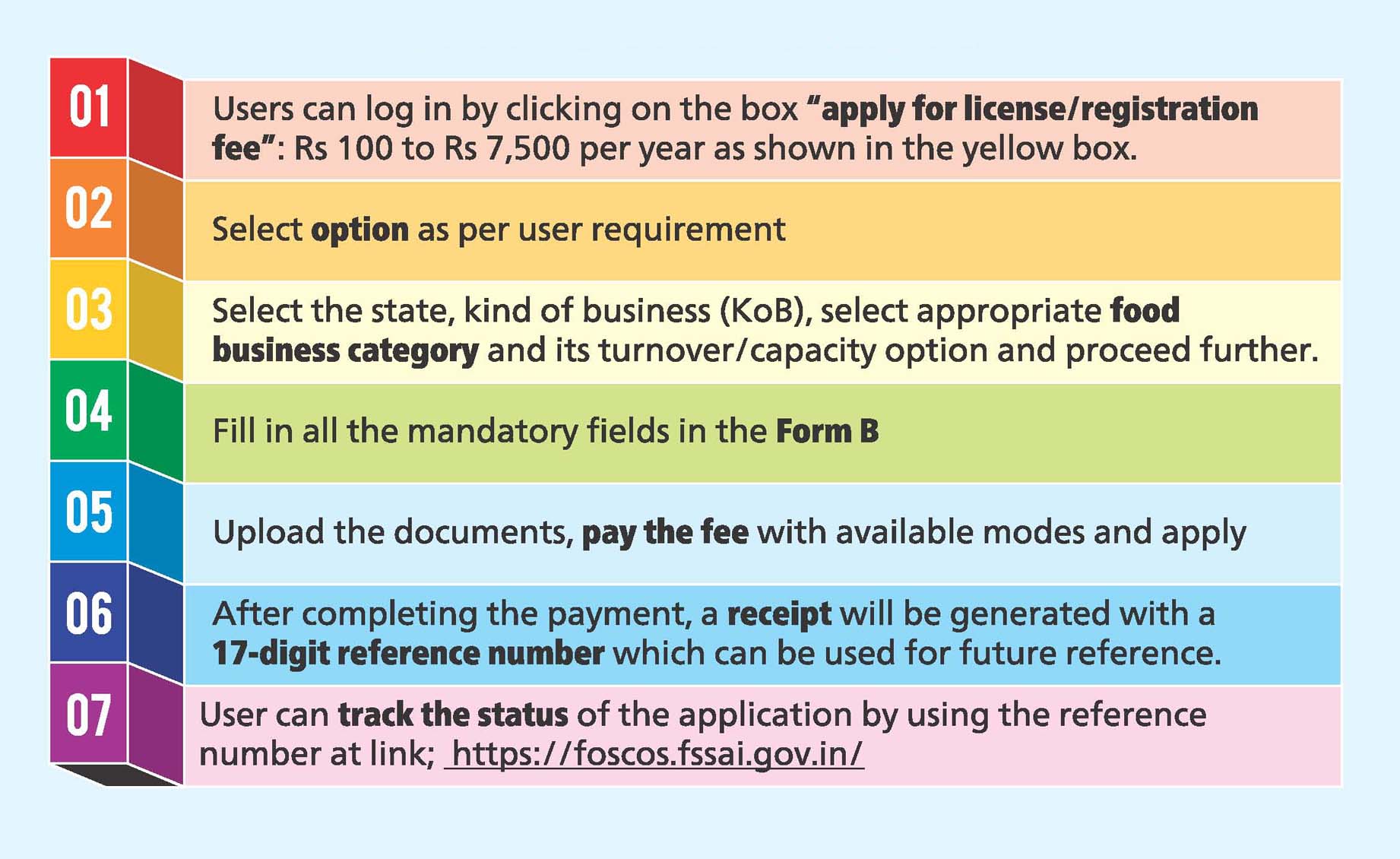 The FSSAI has laid out the science based standards for articles of food and to regulate their manufacture, storage, distribution, sale and import to ensure availability of safe and wholesome food for human consumption. Every food business activity from the wholesaler, manufacturer, distributor to retailer and a petty business operator must register for a food license under Food Safety and Standards Act, 2006. FSSAI has developed a seamless interface called "Food Safety Compliance System (FoSCos)" for registration of different food businesses under FSS Act 2006. A simple and interactive website of the Food Safety Compliance System (FoSCoS) enables the applicant to easily navigate the procedure for filling application for the registration of food business under the FSS Act 2006. The Food Safety Compliance System (FoSCoS) website can be accessed at https: //foscos.fssai.gov.in/